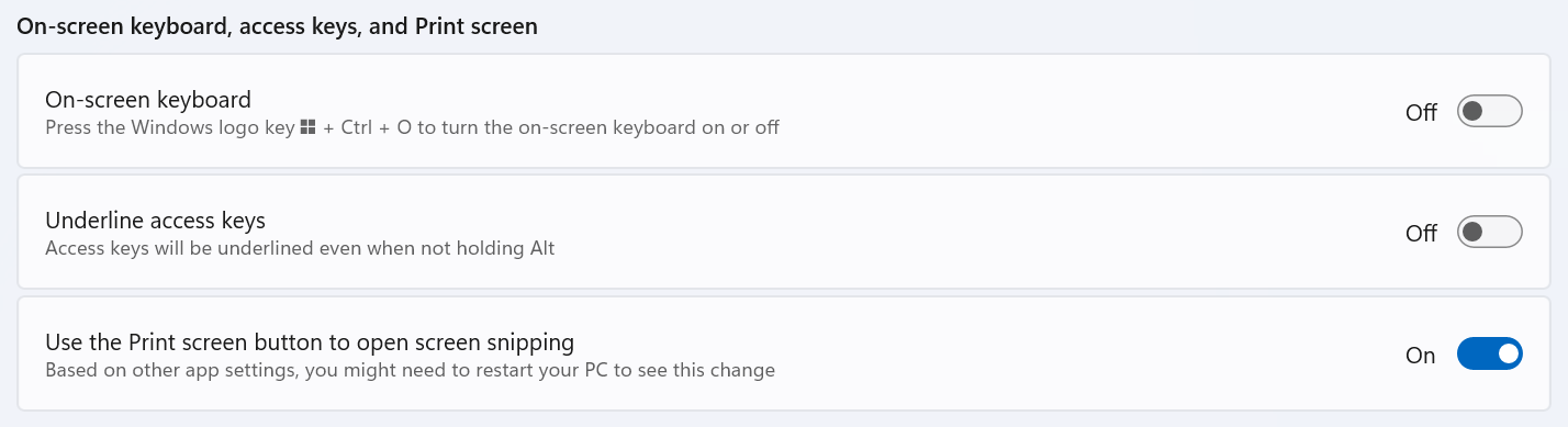 Click the "Change in Windows Settings" then scroll down and locate the below screenshotted section. Toggle the "Use the Print Screen Button to open screen snipping" This will likely require a device restart for this change to be applied as mentioned below the setting name.